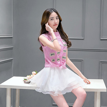 2016春夏新款女裝重工字母貼布立領(lǐng)無(wú)袖襯衫 網(wǎng)紗中裙套裝 /