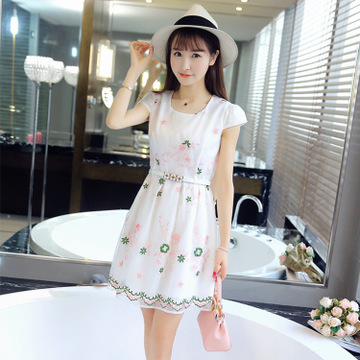 2016夏裝新款 韓版時尚甜美淑女刺繡歐根紗短袖修身顯瘦連衣裙女 /