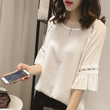 2016夏裝新款雪紡鏤空荷葉邊七分袖上衣寬松顯瘦大碼女裝一件代發 /