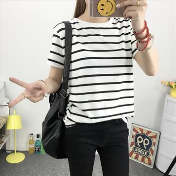2016夏季韓版潮流新款條紋清爽筒約套頭圓領女T恤短袖 /