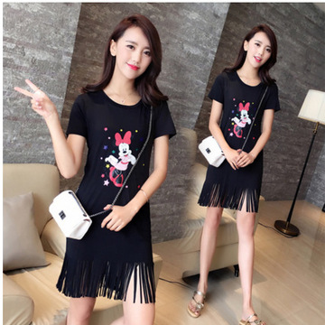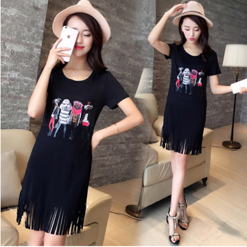 2016新款韓版時尚印花修身中長款流蘇下擺連衣裙 /