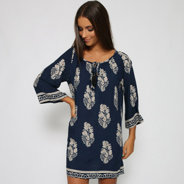 2016新品速賣通Ebay爆款 歐美樹(shù)葉印花寬松連衣裙V領(lǐng)時(shí)尚百搭中裙 /