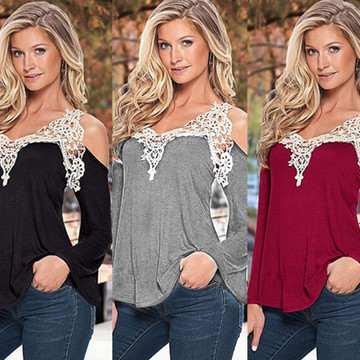 現(xiàn)貨 速賣通 Ebay 爆款 蕾絲花邊拼接性感v領(lǐng)長(zhǎng)袖露肩上衣t恤女裝 /
