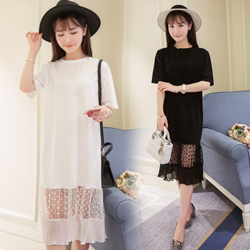2016夏裝韓國新款純色波點甜美圓領網紗百褶蕾絲拼接連衣裙女 /