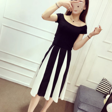 2016新款女裝名媛性感露背系帶純色短袖T恤+撞色半身裙套裝 /