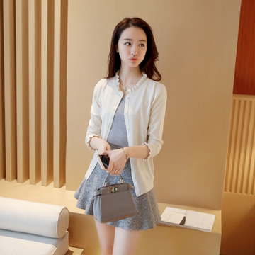 春季新款荷葉邊圓領長袖單排扣短款針織開衫小披肩外套女毛衣批發 /