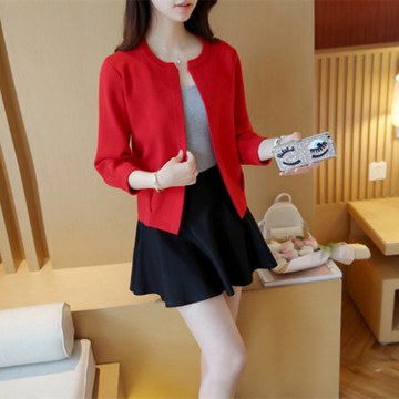 春裝新款圓領七分袖純色寬松短款小披肩針織開衫毛衣女外套批發 /