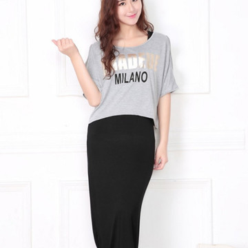 2016夏歐美風(fēng)莫代爾背心長(zhǎng)裙露肩短袖燕尾字母罩衫兩件套連衣裙 /
