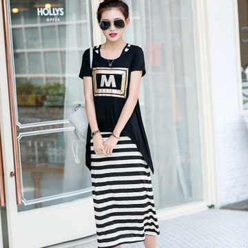 2016新款夏季莫代爾條紋兩件套流蘇燕尾寬松罩衫印花字母連衣裙 /