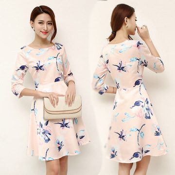 2016新款時(shí)尚氣質(zhì)春裝印花中裙一字領(lǐng)七分袖連衣裙打底修身A字裙 /