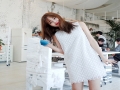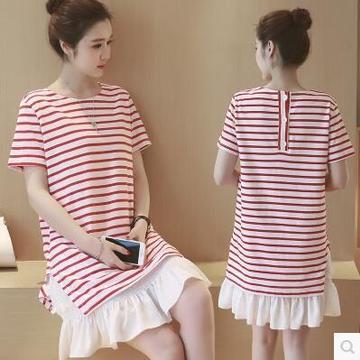 夏季新款韓版女裝圓領(lǐng)短袖拼荷葉邊條紋寬松連衣裙 /