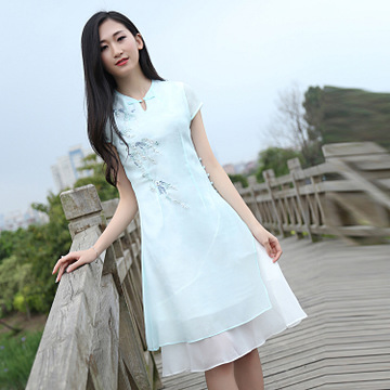 現貨】瓔珞2016春季新款 女裝復古旗袍式中裙 繡花修身顯瘦連衣裙 /