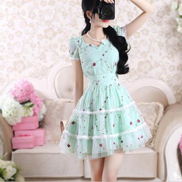 2016夏季新款女裝綠色玫瑰繡花網紗修身顯瘦甜美短袖連衣裙 /