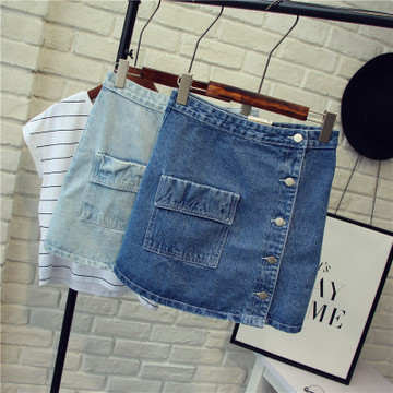 經典百搭款 韓版大口袋排扣高腰復古牛仔半身裙 純棉水洗牛仔短裙 /