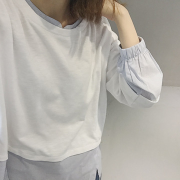 2016韓版拼接牙簽紋細條紋襯衫下擺袖子假兩件竹節棉T恤女 /