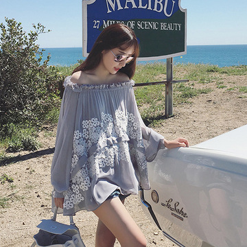 CARIEDO 獨家設(shè)計定制 優(yōu)雅灰拼接奶油蕾絲一字領(lǐng)露肩上衣 /