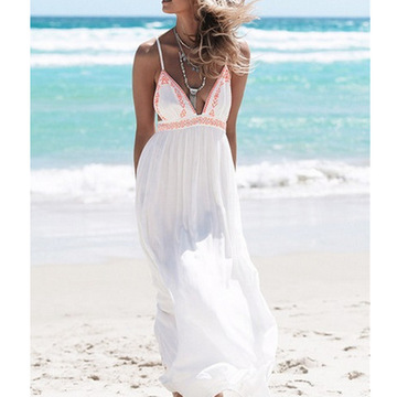 2016歐美新款吊帶裹胸性感露背大擺開(kāi)叉雪紡印花連衣裙 /