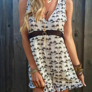 2016ebay速賣通外貿(mào)熱賣無(wú)袖拼接椰樹(shù)印花V領(lǐng)女士連衣裙 /