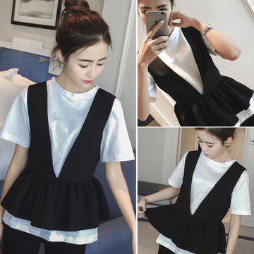 春裝新款韓版魚尾百褶兩件套裝短袖T恤黑白拼色女 /