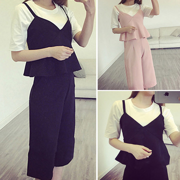 春新款韓版甜美吊帶背心T恤上衣闊腿褲三件套裝女 /