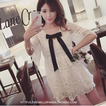 夏季新款歐美蕾絲刺繡鏤空蝴蝶結五分袖連衣裙女 /