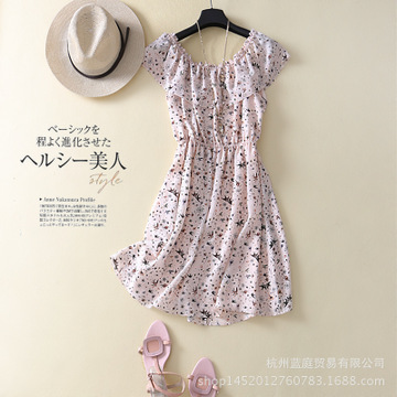 森女范清新減齡 高品質!小燕子印花一字領松緊腰真絲雙縐連衣裙 /