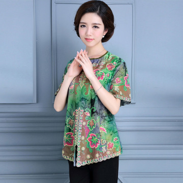 新款夏季中老年媽媽民族風女裝上衣 休閑套頭雪紡短袖 /