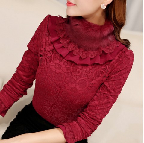 新款兔毛高領加厚加絨蕾絲打底衫女長袖中長款保暖上衣 /