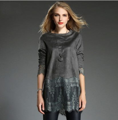 2015新款秋裝中長款蕾絲打底衫女鹿皮絨長袖上衣 /