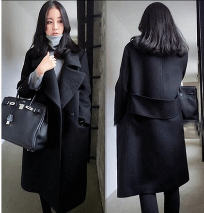 秋冬中長款顯瘦羊毛呢外套夾棉加厚 大翻領黑色寬松呢大衣女 /