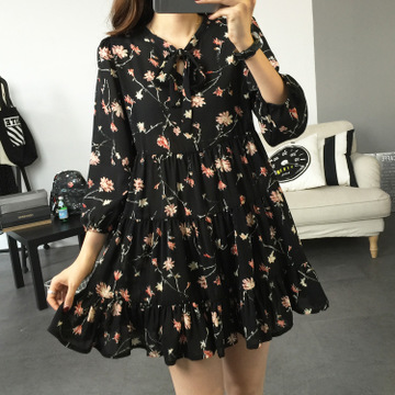 中長款碎花裙女 復古寬松中裙七分袖女士雪紡連衣裙 2016夏季新款 /