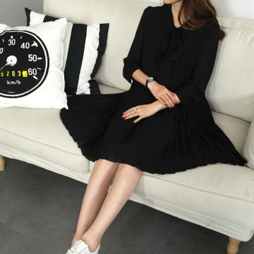 春夏 柔美仙氣飄逸飄帶立領寬松顯氣質壓皺雪紡七分袖百褶連衣裙 /
