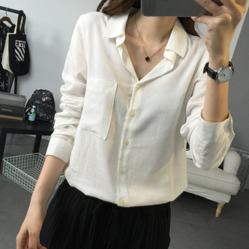 亞麻襯衫紐扣襯衣女 韓風街拍混搭休閑V領長袖防曬衫2016夏季新款 /