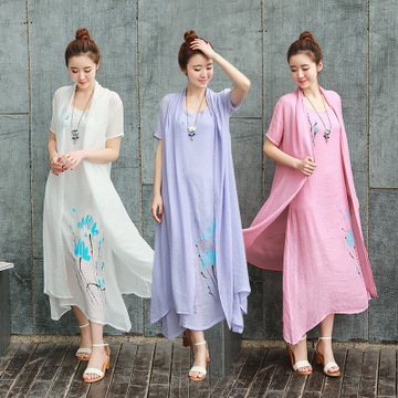 2016女春夏新款棉麻連衣裙短袖套裝裙文藝復古印花兩件套長裙 /