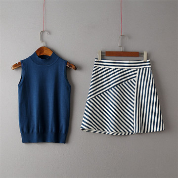 一件代發2016夏季新款 薄款半高領無袖針織衫+拼接條紋半身裙套裝 /