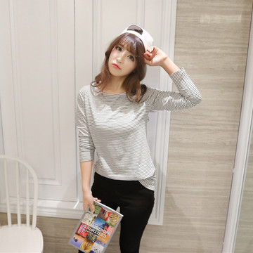 長袖細條紋T恤休閑百搭春季打底衫時尚大碼2016韓版新款女裝純棉 /