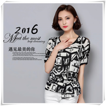 2016夏裝新款短袖雪紡衫女裝 修身中長(zhǎng)款大碼韓版夏季歐根紗上衣 /