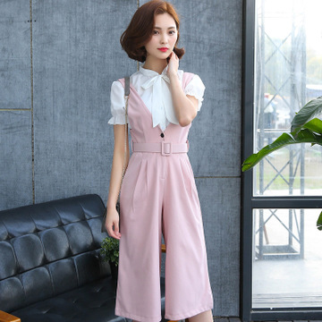 實拍2016新款韓版時尚上衣背帶連體褲套裝女寬松闊腿褲兩件套 /