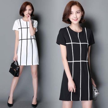2016夏季新款大碼短袖拉條黑白顯瘦通勤連衣裙 /