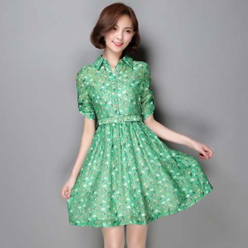 2016春裝新款女裝通勤印花亞麻翻領(lǐng)襯衫連衣裙女A字裙子 /