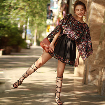 2016夏季新款波西米亞重工刺繡花一字領黑色連袖迷你連衣裙短裙女 /