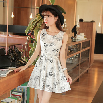 2016夏季新款韓版甜美可愛印花蕾絲短袖連衣裙女裝 /
