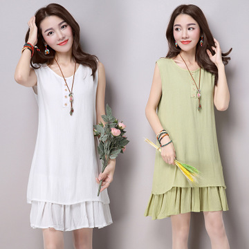 【實拍】雙層裙子棉麻裙長款打底連衣裙純色吊帶背心長裙 /