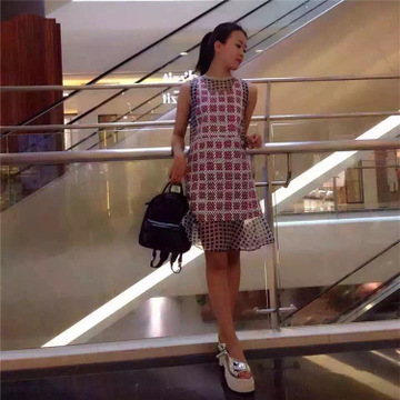2016夏裝新款甜美百搭格子印花拼接荷葉邊圓領無袖連衣裙3M2O340 /