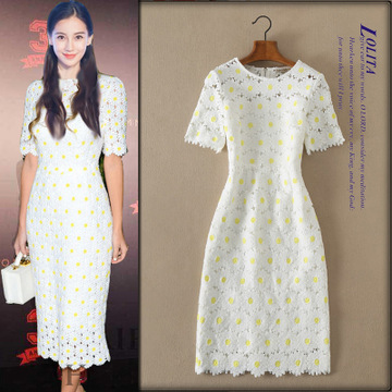 汐檸女裝2016新款女裝明星同款歐美時尚蕾絲刺繡菊花修身短袖連衣裙潮 /