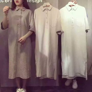 2016新款女裝韓版長款純色翻領打底襯衫裙子中袖寬松夏季連衣裙 /