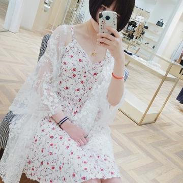 日系人氣s家蕾絲拼接碎花V領吊帶+高腰百褶半身裙兩件套套裝 /