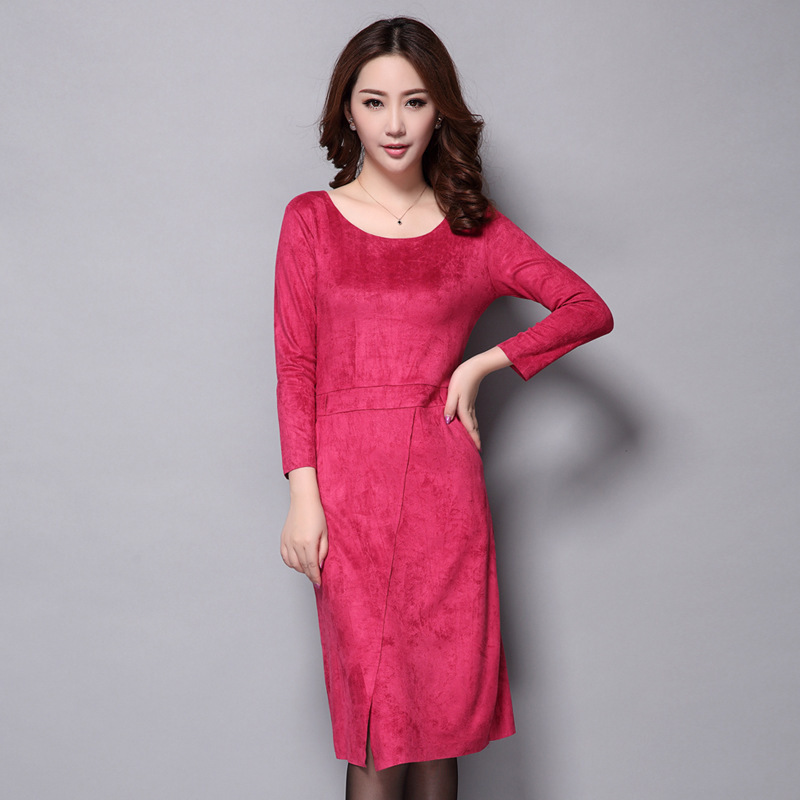 歐洲站新款長裙女裝開叉歐美大牌修身麂皮絨九分袖秋冬打底連衣裙 /