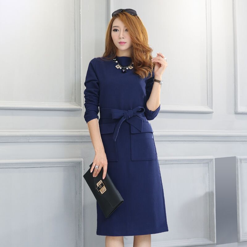 2015冬裝新款韓版顯瘦中長裙圓領純色修身外套雙面呢料長袖連衣裙 /