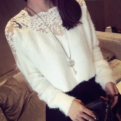 秋冬新款韓國圓領(lǐng)蕾絲拼接馬海毛長袖針織毛衣女打底衫 /